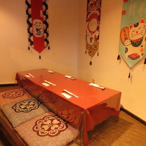 奥には、華やかな招き猫のタペストリーが飾られた小上がりのお座敷席をご用意しています♪赤いテーブルクロスが印象的な空間は、どこか懐かしく温かい雰囲気◎靴を脱いでゆったりと寛げるため、ご友人同士の飲み会や小規模な宴会に最適です♪